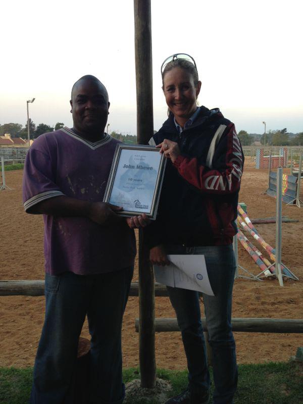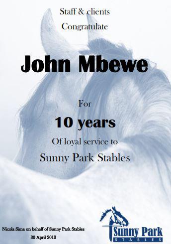 [dropcap style=”font-size: 70px; color: #052b51; font-family: ‘Droid Serif’, Arial, sans-serif;”] O [/dropcap] ur grooms are the backbone of our yard. They ensure the health, care and wellbeing of our beloved horses. At the end of April, John Mbewe had been with Sunny Park Stables for ten years! In a special ceremony we presented him with an award for his loyal service and including some well deserved perks in his current pay packet.