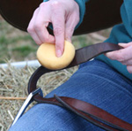 Start by wiping off any excess dirt from the surface of the leather. Then use a damp—not wet—sponge or cloth to work your soap into the leather. Small tack sponges, available inexpensively at any tack shop, are ideal because they are soft and non-abrasive, and small enough to get into all areas of the tack. Make sure you concentrate on the areas around the buckles and the folds in the leather by the reins and in your stirrup leathers. Wipe off any excess soap residue with a damp cloth.